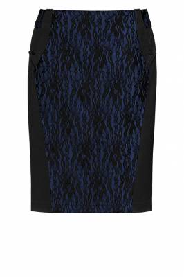 Эффектная модель с модными кружевными вставками, оттенёнными тёмно-синей тканью. Украшена фигурными клапанами на пуговице, переходящими в шлёвки на талии. Сзади шлица. (Длина-60см)
