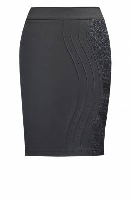 Нарядная модель со вставкой из жаккардовой ткани и отделкой волнистыми защипами и черными стразами. Сзади шлица. (Длина-60,65см)