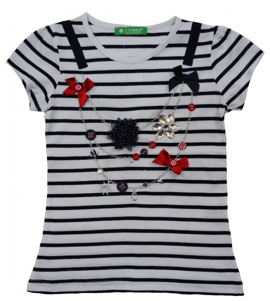Мягкий трикотаж в яркую полоску, красивая модель, стильные украшения понравятся девочкам.