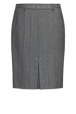 Юбка-карандаш с несколькими рельефными швами, зрительно стройнящими фигуру. Сзади встречная складка, на поясе декоративный хлястик с интересной отделкой люверсами. Длина 62см